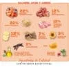 Salmón deshidratado 22%, arroz integral 22%, manteca de cerdo ibérico 13%, atún deshidratado 12%, copos de patata deshidratada 12%, cebada integral 7%, aceite de salmón 3%, algarroba 3%, hidrolizado de hígado de pollo, aceites esenciales de orégano, canela, clavo, tomillo, romero, equinácea purpúrea, té verde, protectores hepáticos(cardo mariano, extracto de yuca schidigena, boldo y aceite de camelina) miel el polvo, protectores articulares (condroitín sulfato, colágeno y glucosamina), levaduras, vitaminas, mejoradores digestivos (manano-oligosacáridos MOS, fructo-oligosacáridos FOS), oligoelementos y conservantes naturales.